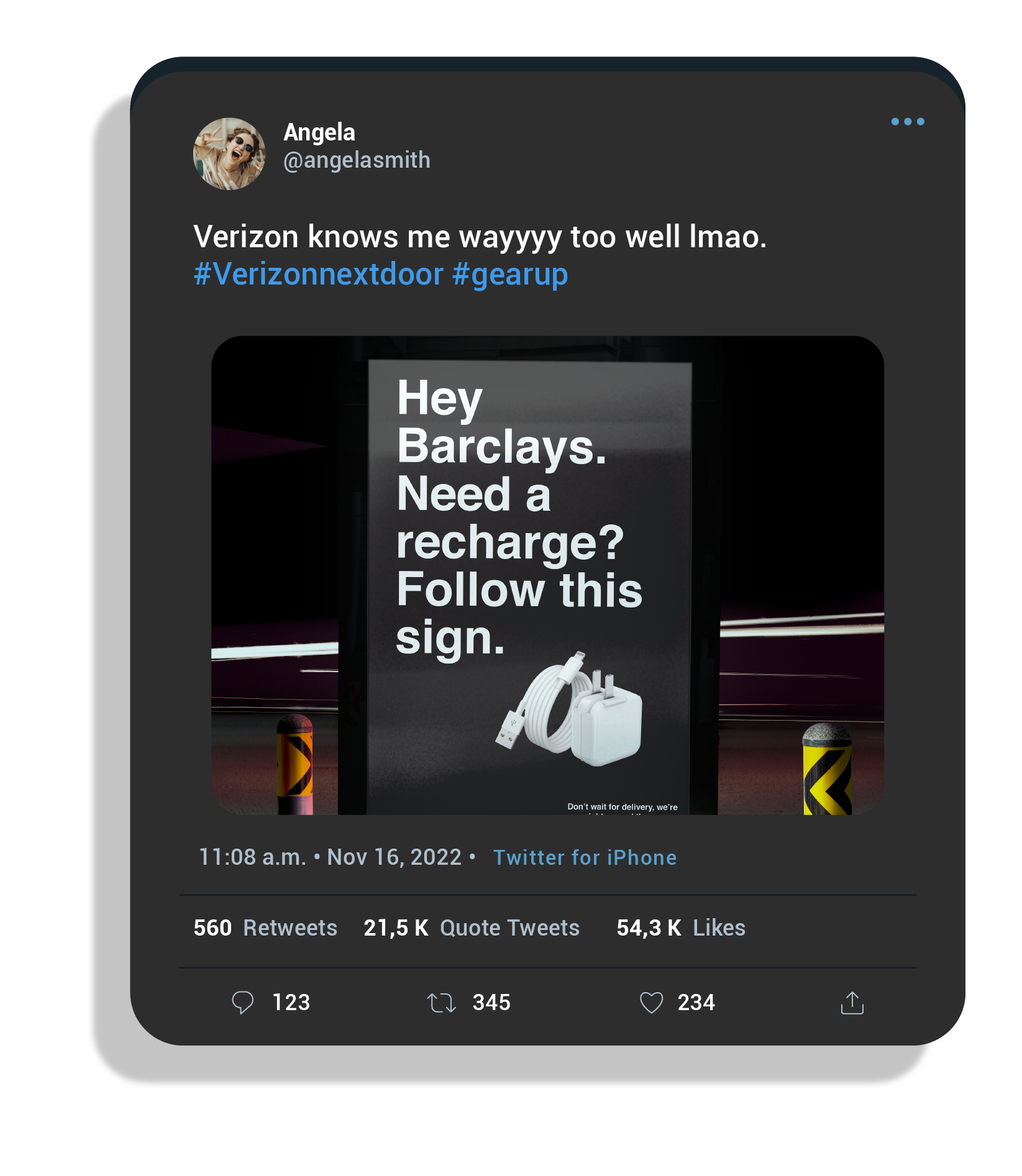 With this insight in mind, we created this location based campaign to not only highlight the high end tech accessories Verizon offers, but how quick and easy it is for people in the area to grab the accessories they need.
